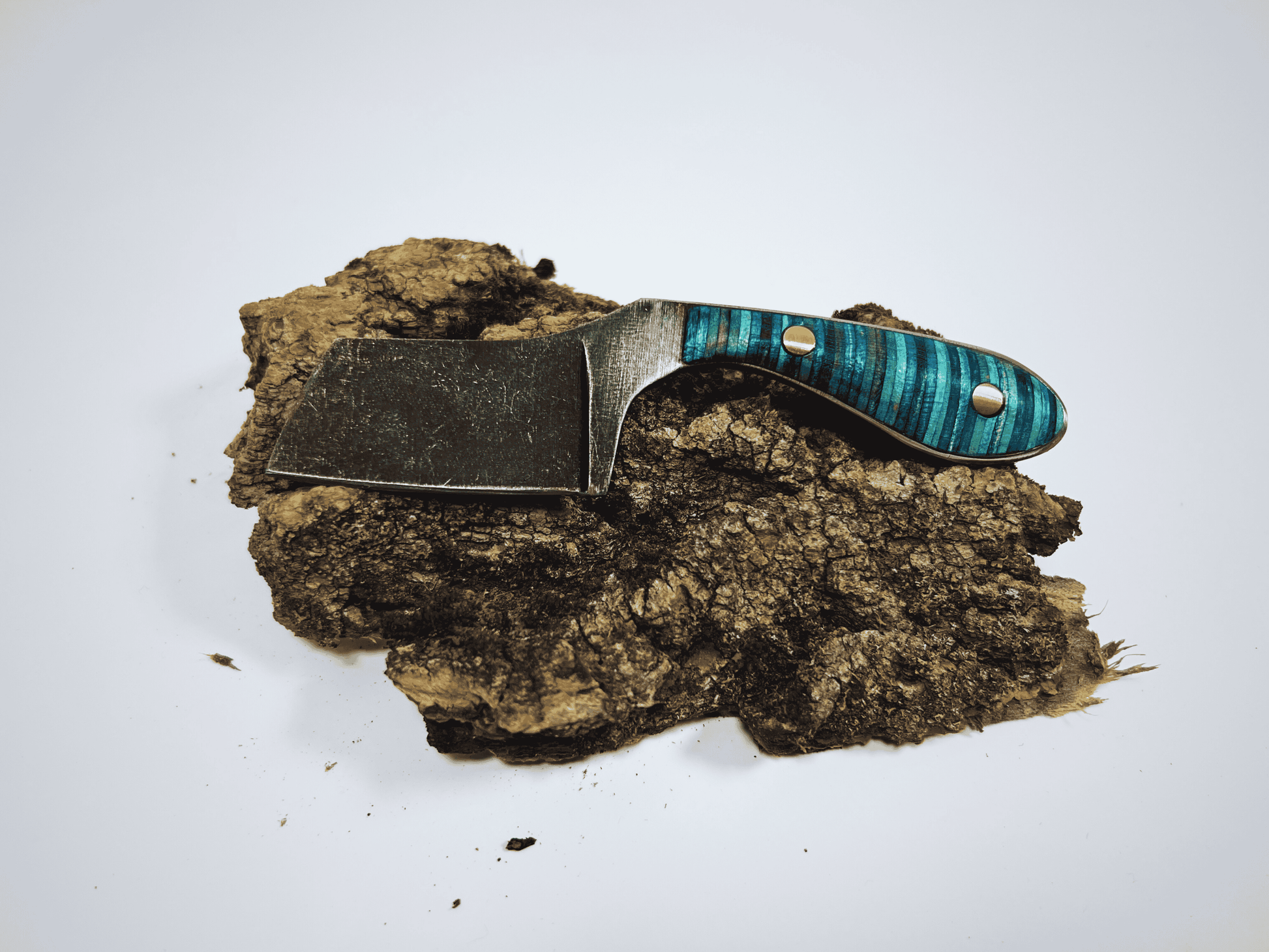 Forged from 1095 high-carbon steel, this compact cleaver is shaped for precision and control in everyday prep. The blade undergoes an acid bath and a slow rock tumble to create its weathered, tactile finish, a surface that carries the quiet marks of process and time.
